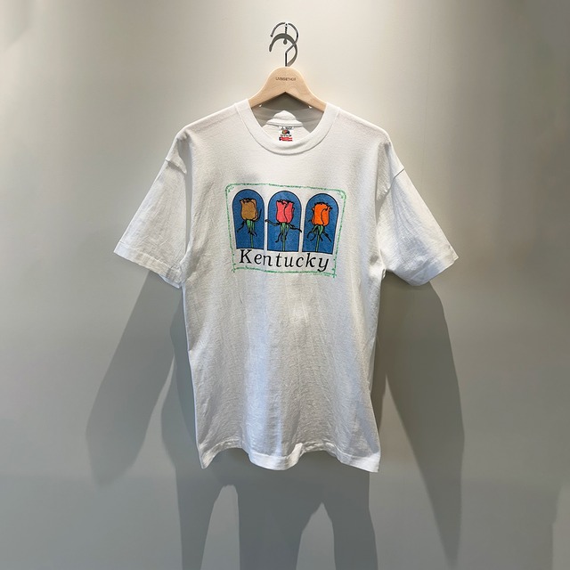 【アイテム説明】 Kentuckyのもう一つの顔。バラ3本が柔らかく描かれた、ナイスカラ ーリングの観光TEE。お土産モノ感とレトロな洒落っ気がちょうどいいデス。 【サイズ・コンディション】 身丈:79cm 身幅:52.5cm 袖丈:21.5cm サイズ表記:L 混率:C/100 コンディション:B S:Special Stock 未使用品・デッドストック。長い時間を経ても眠ったまま残された貴重な状態。 A:Excellent Condition 使用感がほとんどなく、非常にきれいな状態。古着・雑貨ともに安心して使えるクオリティ。 B:Good Condition 一般的なユーズド感あり。軽いキズやスレ、汚れはあるが、日常使いに支障のないコンディション。 C:Well-used 明確なダメージや汚れが見られるが、その分ひとつひとつに個性や雰囲気がある状態。 D:Rough Used 強い使用感や大きなダメージが残る。実用よりも雰囲気重視、ディスプレイやリメイクにおすすめ。