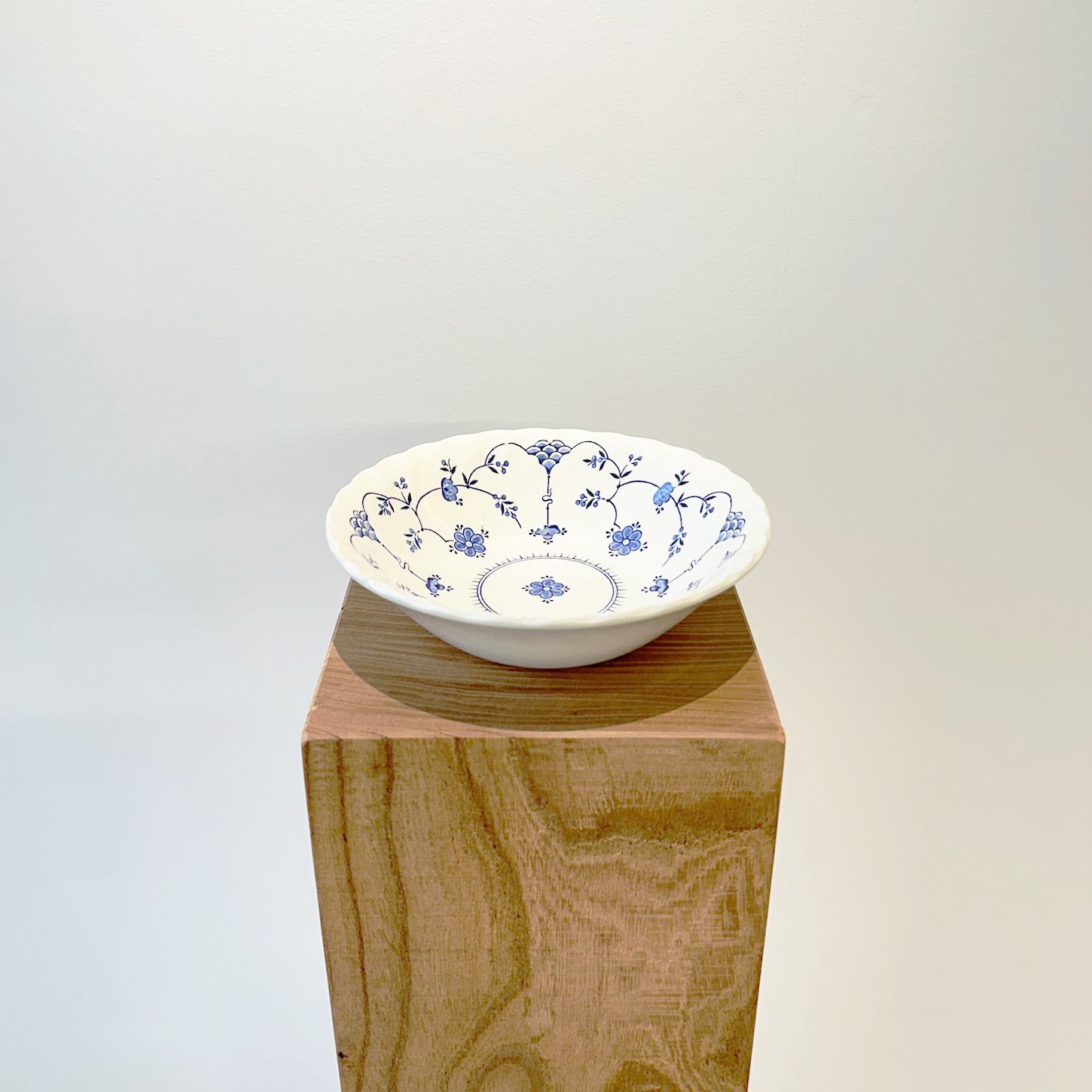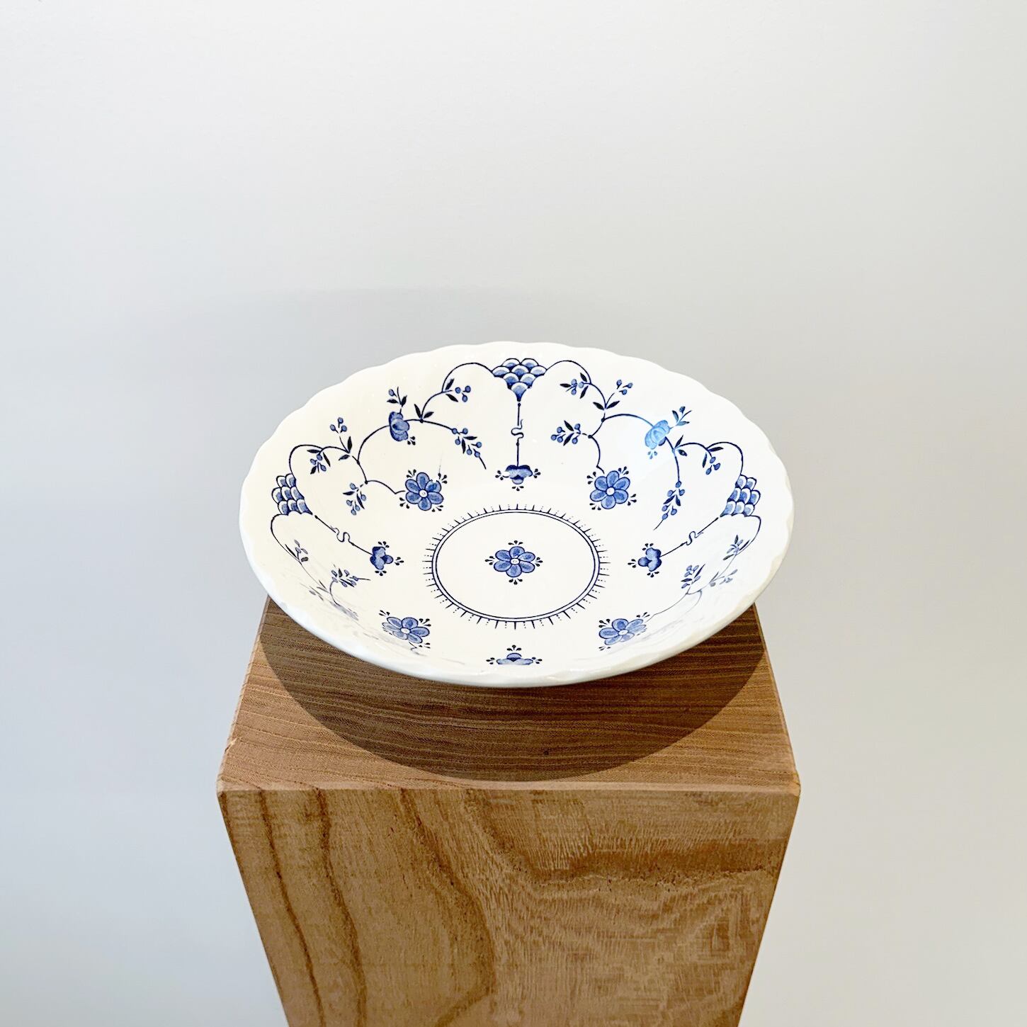 波打つリムに沿って優しく立ち上がった形と、中心から広がる花模様が特徴的です。