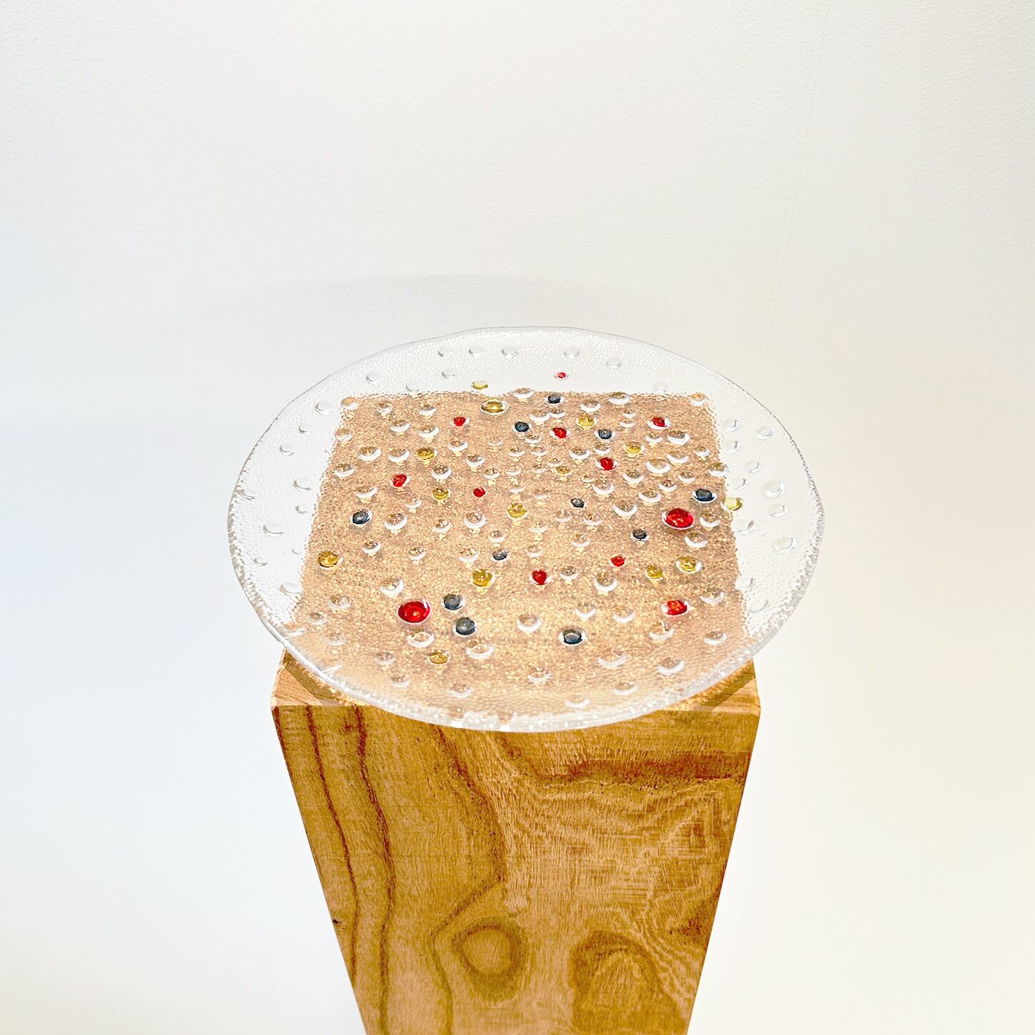 整然と並ぶ気泡の中に、小さな色ガラスの粒が埋め込まれた平皿。
