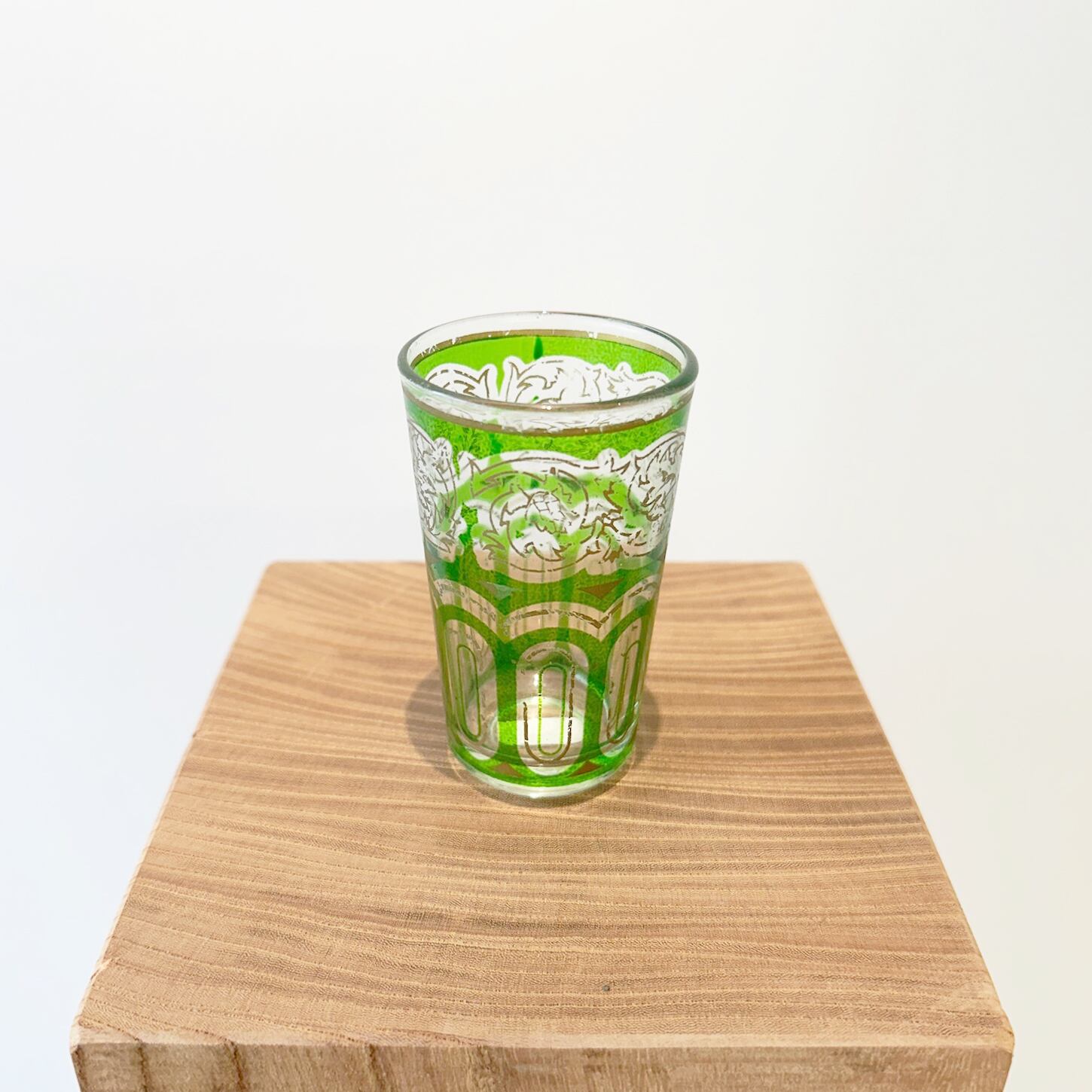 モロッコの伝統的なミントティーグラスを思わせる、鮮やかなグリーンと金色の装飾。