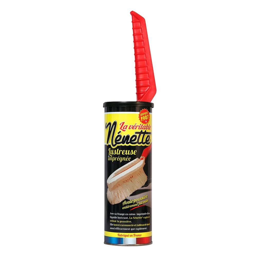 1947年にフランスで生まれたNénette®(ネネット)は、洗浄剤と光沢剤をミックスしたオリジナルのポリッシャー液〈Nénetol®(ネネトル)〉を浸したコットンフリンジモップです。ネネットで拭き取るだけで、汚れやホコリをフリンジに吸着させ、同時に車体や車内のダッシュボードを瞬時に輝かせます。2度拭きも必要ありません。